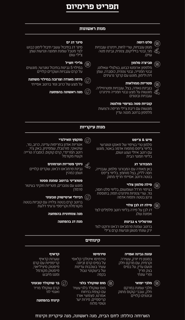 - ארוחת ערב הכוללת: לחם הבית, מנה ראשונה, מנה עיקרית וקינוח