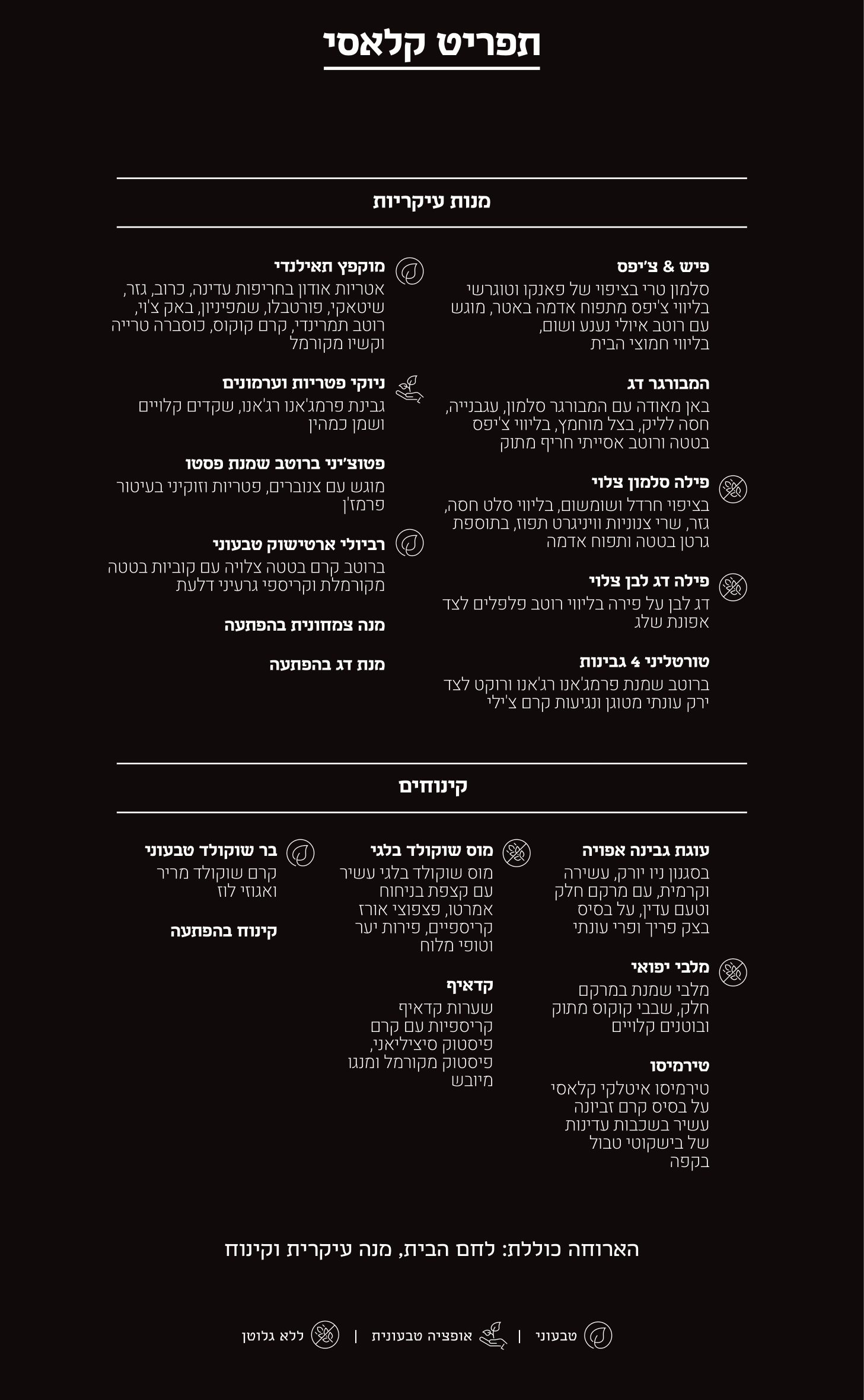- ארוחת ערב הכוללת: לחם הבית, מנה לבחירה וקינוח