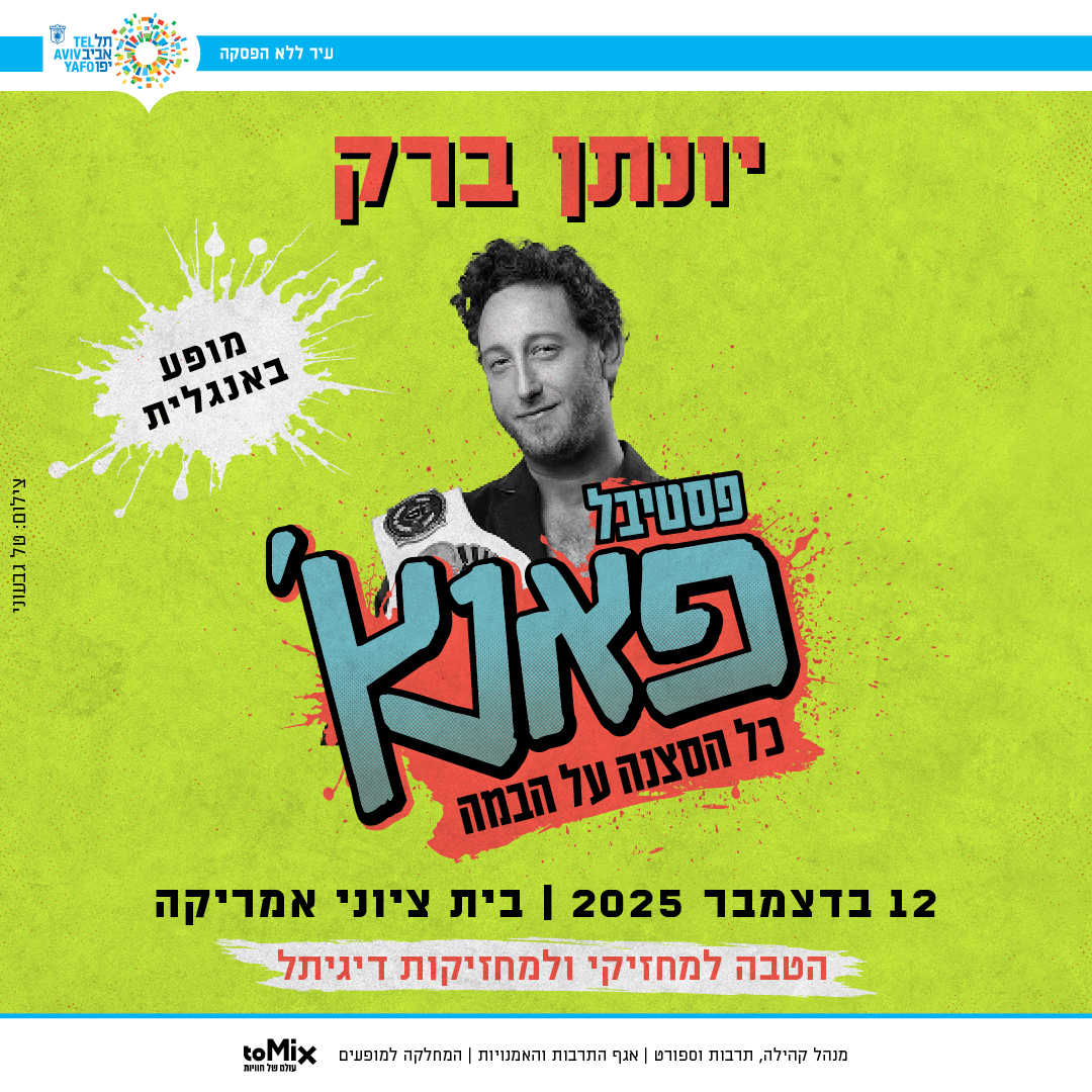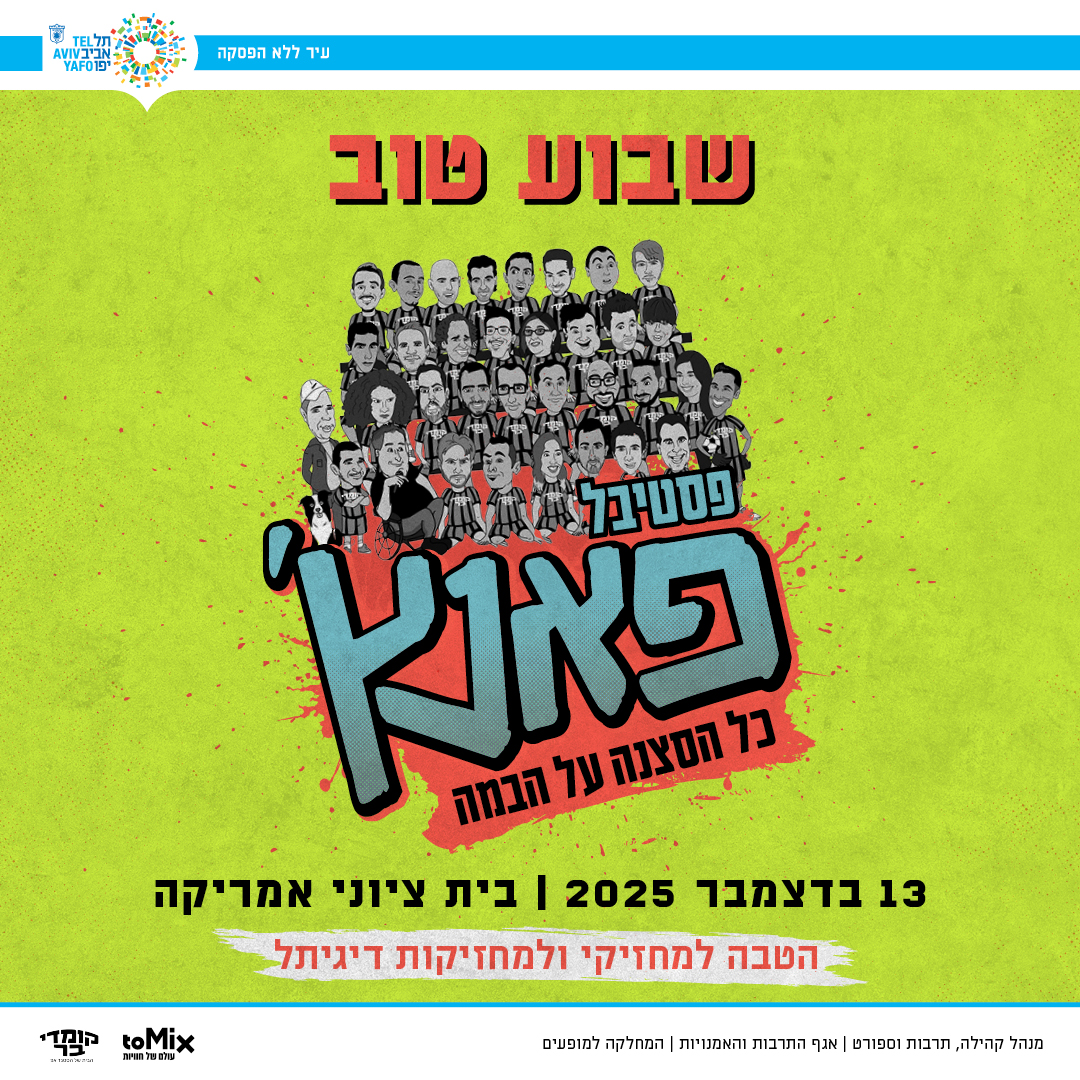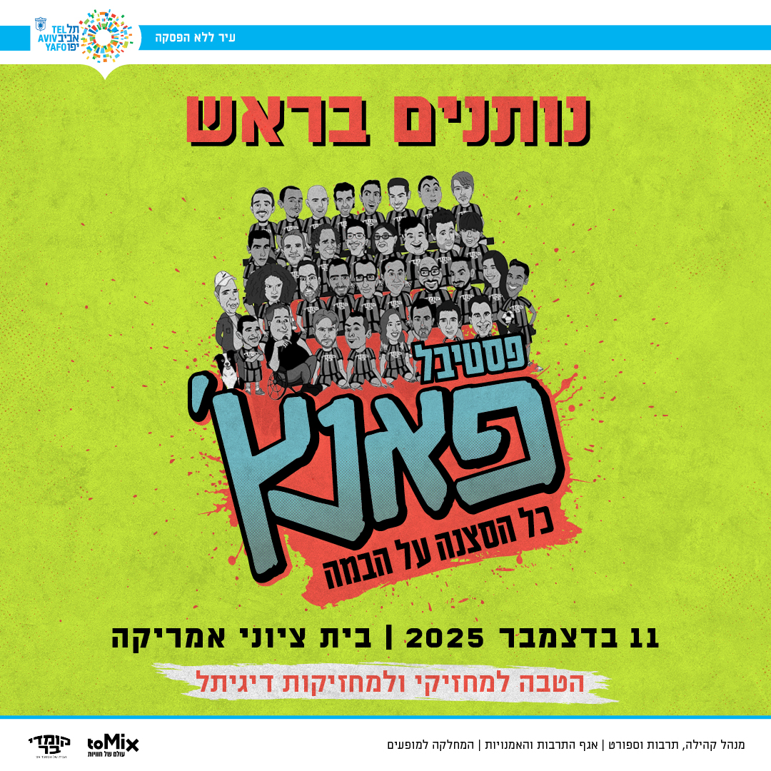 העיר שלא נחה מקבלת סוף־סוף את מה שהיה חסר לה: פסטיבל קומדיה וסטנדאפ עם כל השמות הכי חמים בסצנה. אחרי שנתיים שלא השאירו מספיק מקום לצחוק, תתקיים בתל אביב חגיגה תלת־יומית של הומור ישראלי בועט ולוהט בבית ציוני אמריקה. בין ה־11 ל־13 בדצמבר יציג פסטיבל פאנץ׳ הראשון שלושה ימים של מופעים, בכורות, מרתונים חד־פעמיים ומפגשים מפתיעים שיצבעו את החורף התל־אביבי בצחוק.