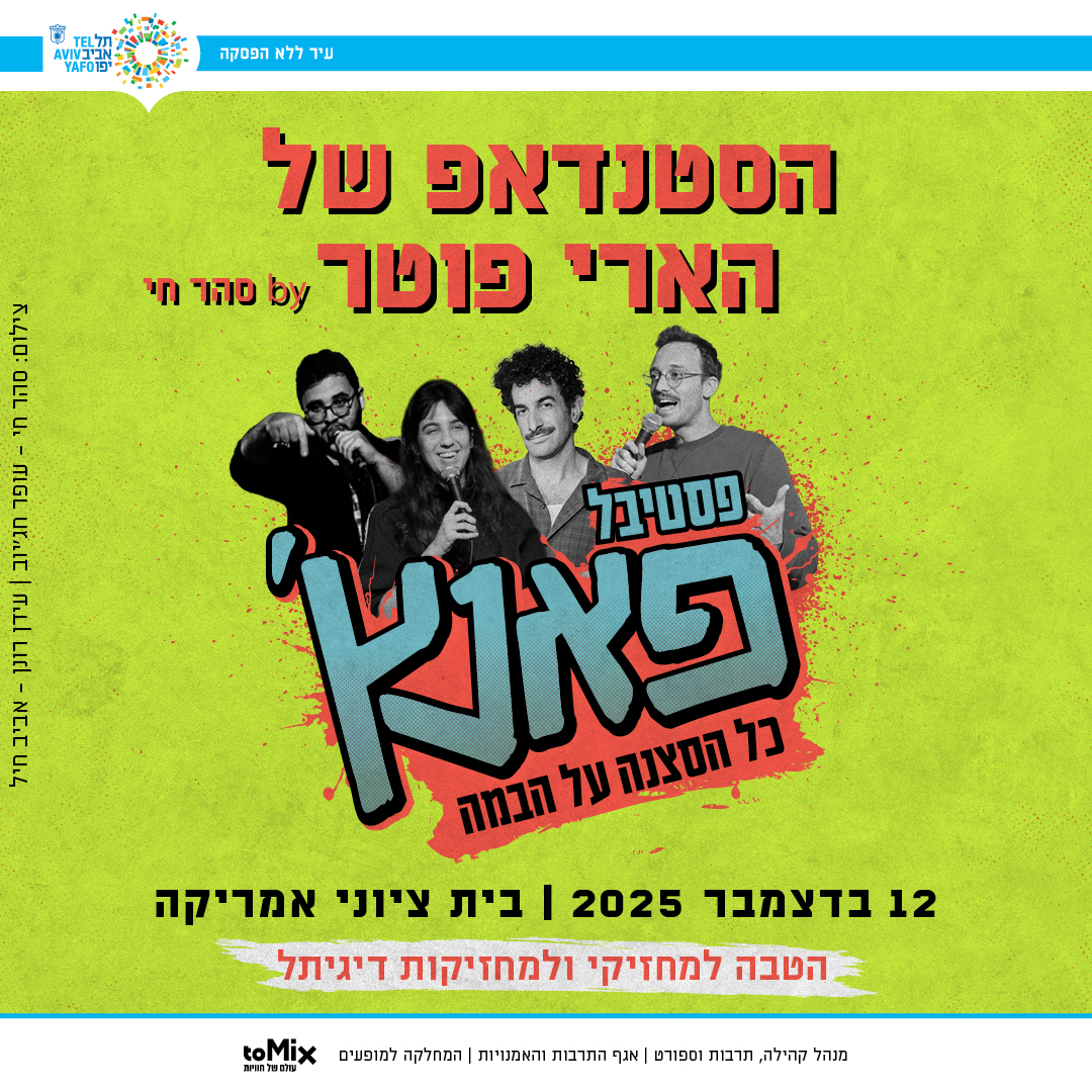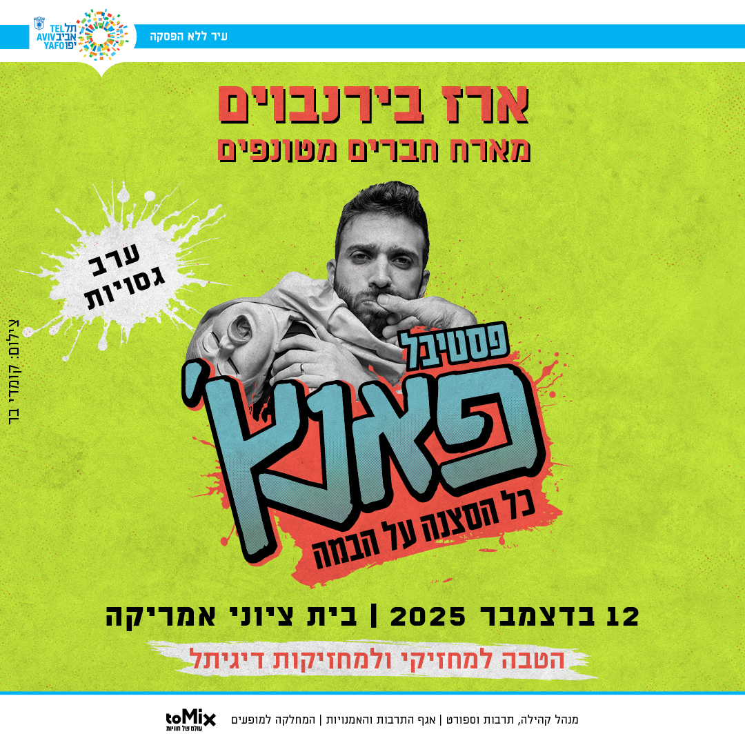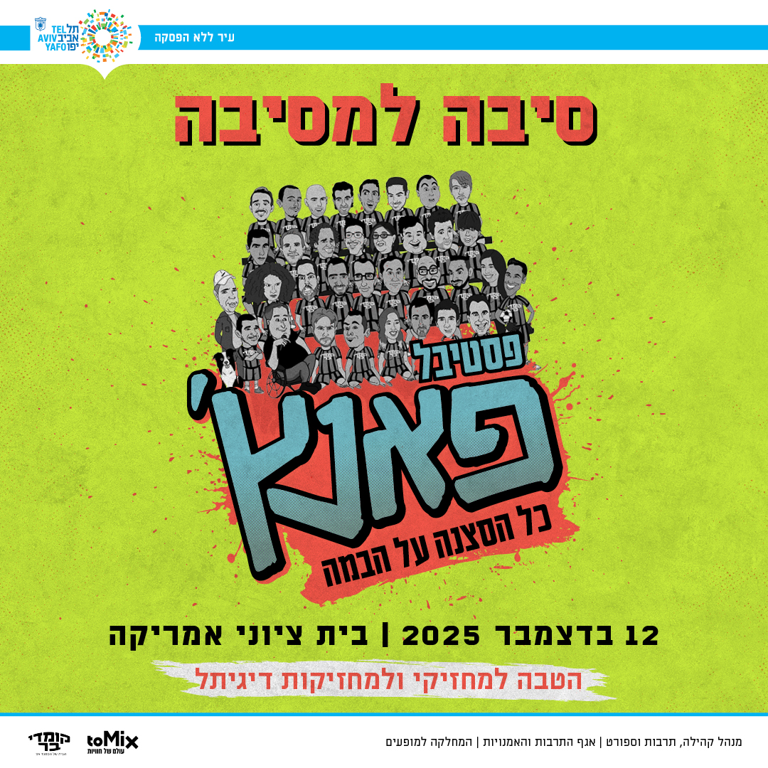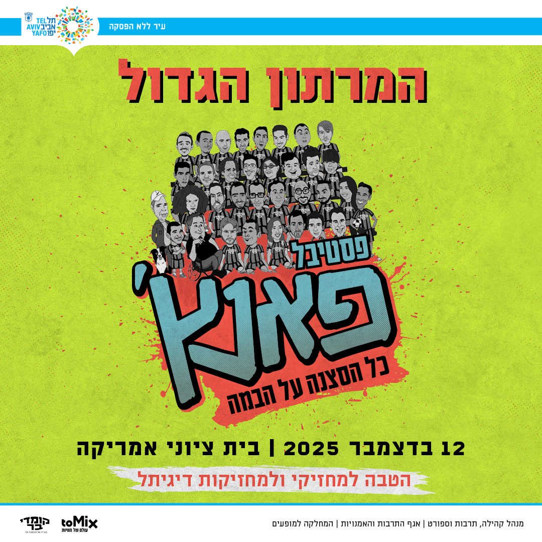 העיר שלא נחה מקבלת סוף־סוף את מה שהיה חסר לה: פסטיבל קומדיה וסטנדאפ עם כל השמות הכי חמים בסצנה. אחרי שנתיים שלא השאירו מספיק מקום לצחוק, תתקיים בתל אביב חגיגה תלת־יומית של הומור ישראלי בועט ולוהט בבית ציוני אמריקה. בין ה־11 ל־13 בדצמבר יציג פסטיבל פאנץ׳ הראשון שלושה ימים של מופעים, בכורות, מרתונים חד־פעמיים ומפגשים מפתיעים שיצבעו את החורף התל־אביבי בצחוק.